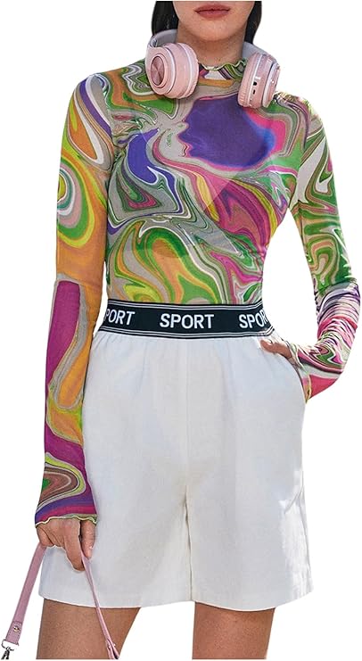 Women’s Sexy Mock Turtle Neck Long Sleeve Shirts Sheer Mesh Geo Print Going Out Bodysuit Tops