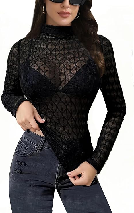 Womens Lace Mesh Long Sleeve Top Floral Sheer See Through Sexy Tops Mock Neck Shirts Party Club Night Blouses