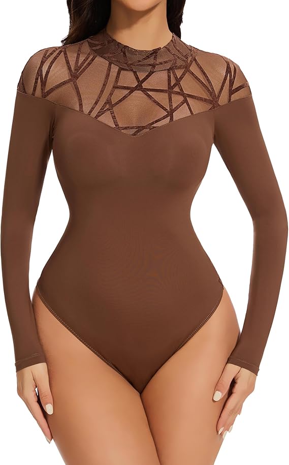 Women's Sexy Cutout Turtle Neck Long Sleeve Sheer Mesh Thong Bodysuits Tops Trendy Fall Going Out Outfits