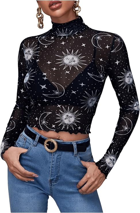 Women's Sun Face Print Mesh Crop Top Long Sleeve Mock Neck See Through Tee Shirt