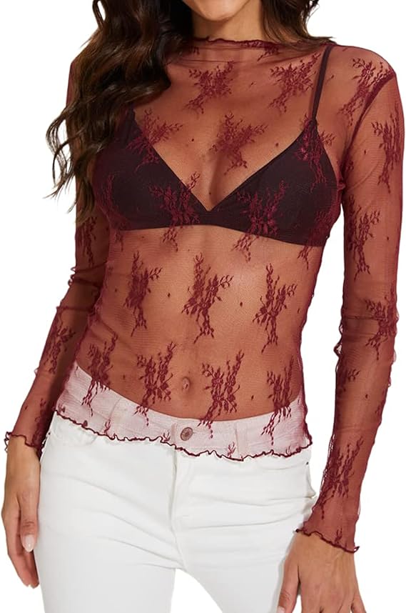 Mesh Top for Women Long Sleeve Sheer Top Lace Floral Mesh Shirt Mock Neck Sexy See Through Layering Tops