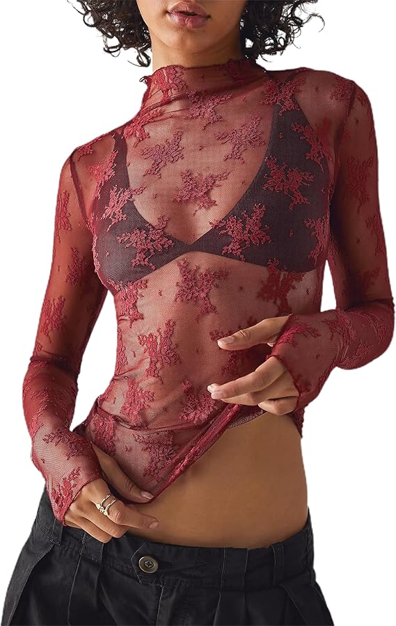 Lace Tops for Women Long Sleeve Mesh Top Mock Neck Sheer Blouse See Through Lace Shirt Layering Top