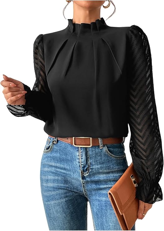 Women's Solid Mesh Flounce Long Sleeve Blouse Frill Mock Neck Shirt Tops