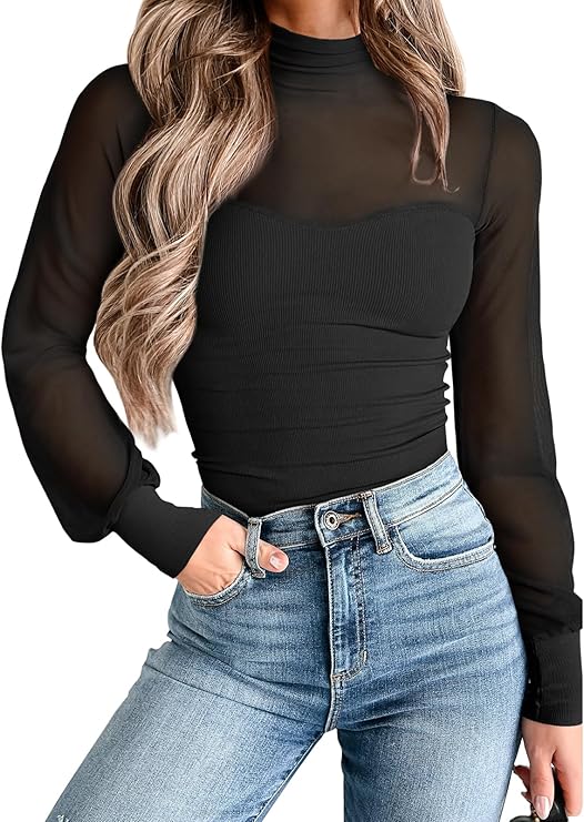 Mesh Top Women Long Sleeve Shirts See Through Party Layering Mock Neck 2024 Fall Sheer Undershirt