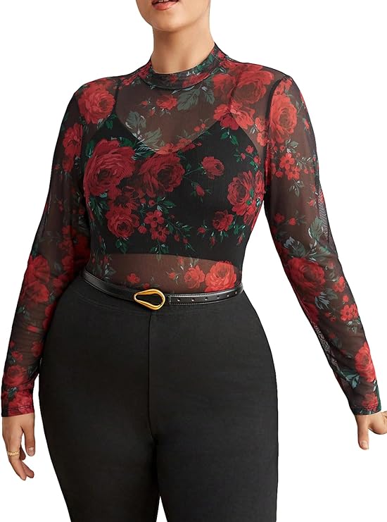 Women's Plus Size Floral Print Mesh Sheer T Shirt Mock Neck Long Sleeve Tee Tops