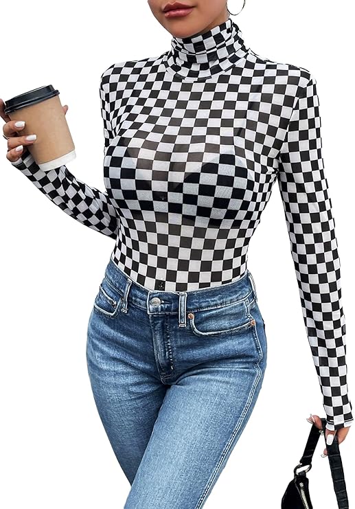 Women's Mock Turtle Neck Checkered Long Sleeve Sheer Plaid Tshirt Bodysuit