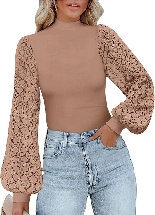 Women's Bodysuit Contrast Mesh Bishop Long Sleeve Mock Neck Bodysuit T Shirt Tops