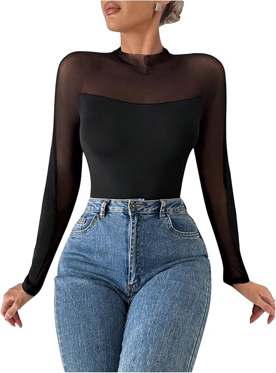 Women's Contrast Sheer Mesh Bodysuit Long Sleeve Mock Neck See Through Shirt Top