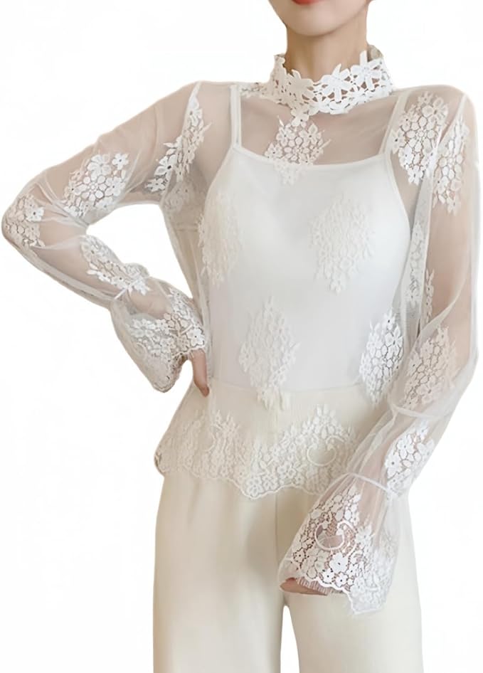 Mesh Top for Women Long Sleeve Sheer Top Lace Floral Mesh Shirt Mock Neck Sexy See Through Layering Tops