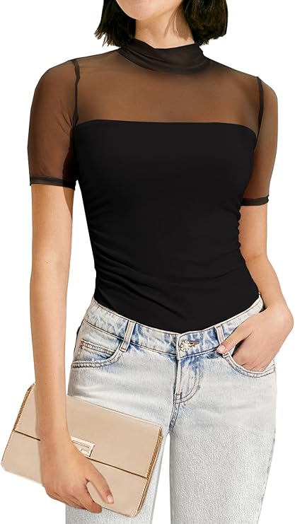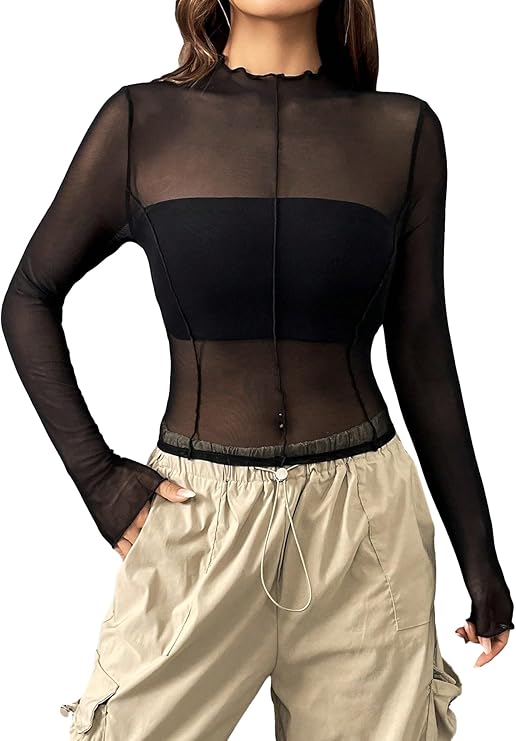 Mesh Top for Women Long Sleeve Mock Neck Mesh Shirt Sheer Top Solid Floral Tee Shirts S-XXL
