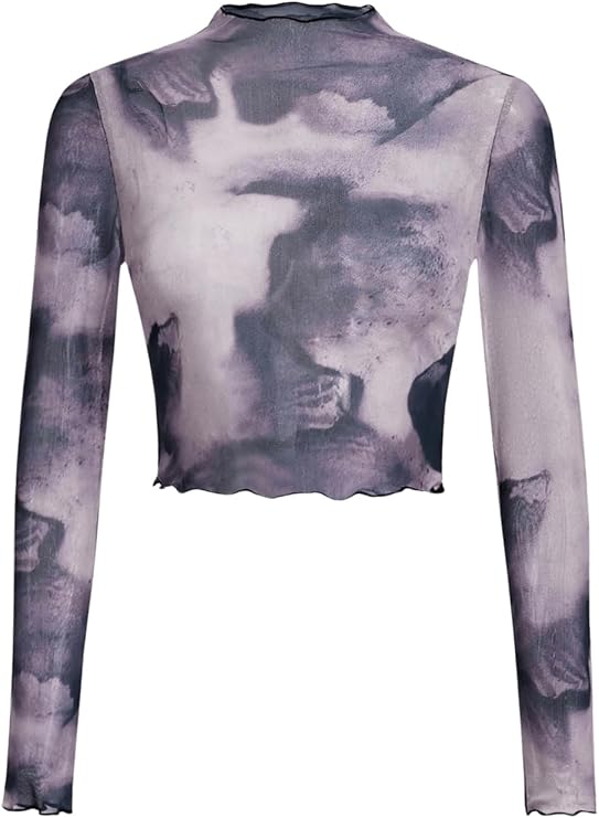Women's Tie Dye Mesh Sheer Mock Neck Long Sleeve T Shirts Lettuce Trim Slim Fit Crop Tops