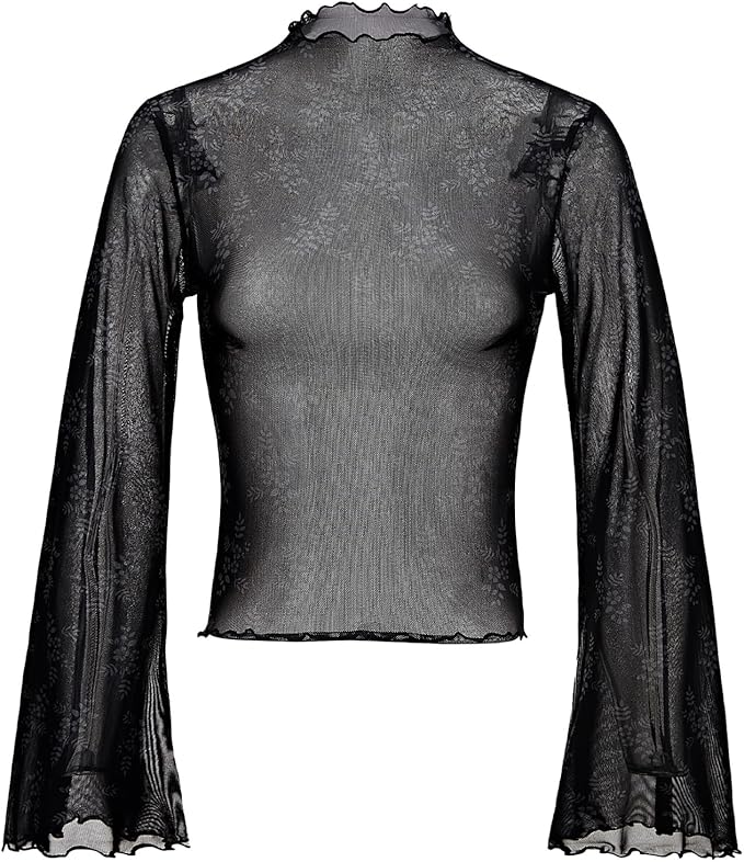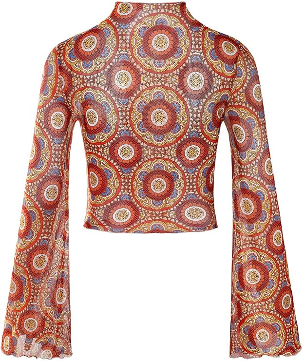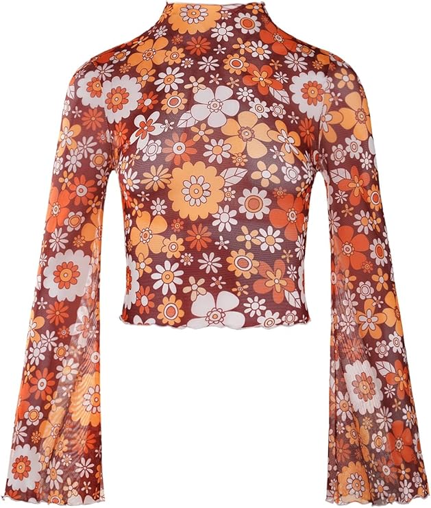 70s Womens Bell Sleeve Top Floral Tops for Women Disco Outfit Mock Neck Flare Tops Semi Sheer Mesh Long Sleeve Top