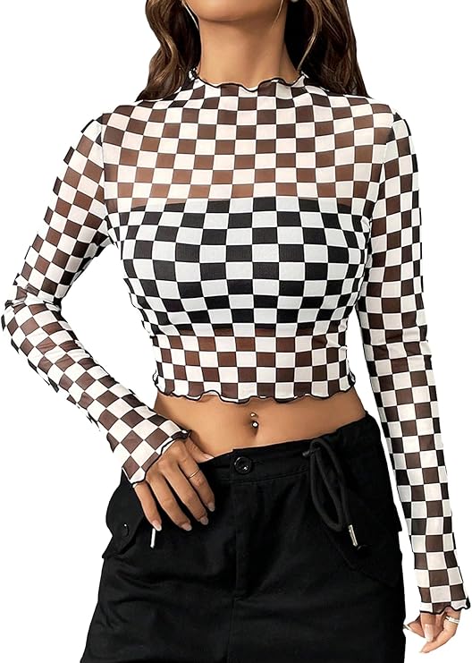 Women's Long Sleeves Mesh Sheer Mock Neck Crop Tops Tee
